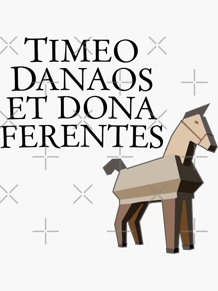 Timeos Danaos Et Dona Ferentes. Timeo Danaos et dona ferentes - "Beware of Greeks bearing gifts" (Virgil Aeneid)about the meaning, origin, history, Virgil and Homer, the Trojan War, Latin l. The meaning of TIMEO DANAOS ET DONA FERENTES is I fear the Greeks even when they bring gifts